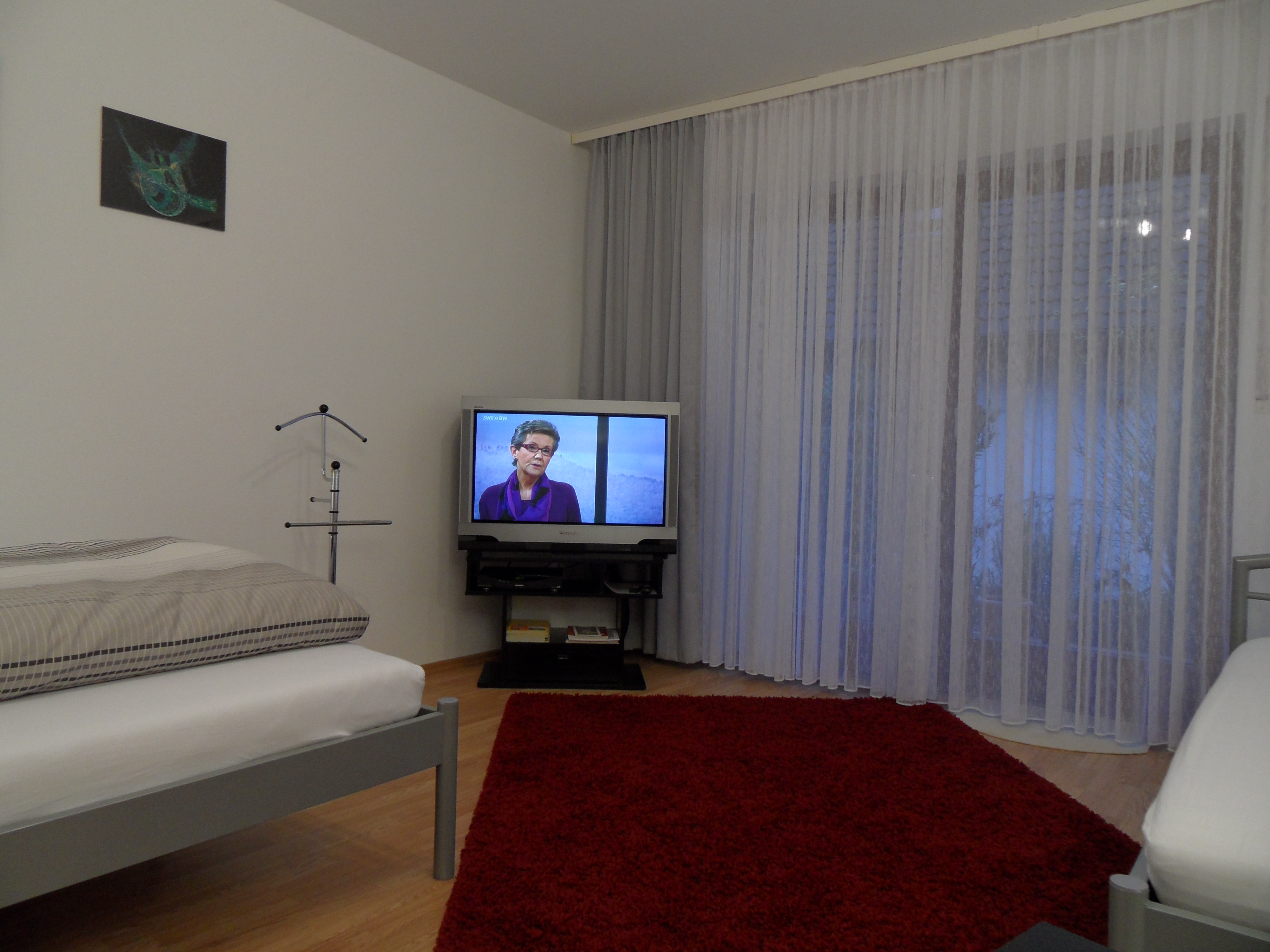 Geniessen Sie in einem gemütlichen Wohn-/Schlafraum 2 Betten, je 140 cm breit, und die bequeme Sitzcouch bei Sat-TV mit 39“, Lesen oder Spielen.
